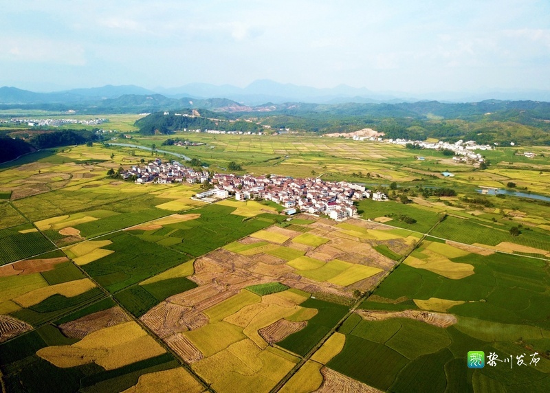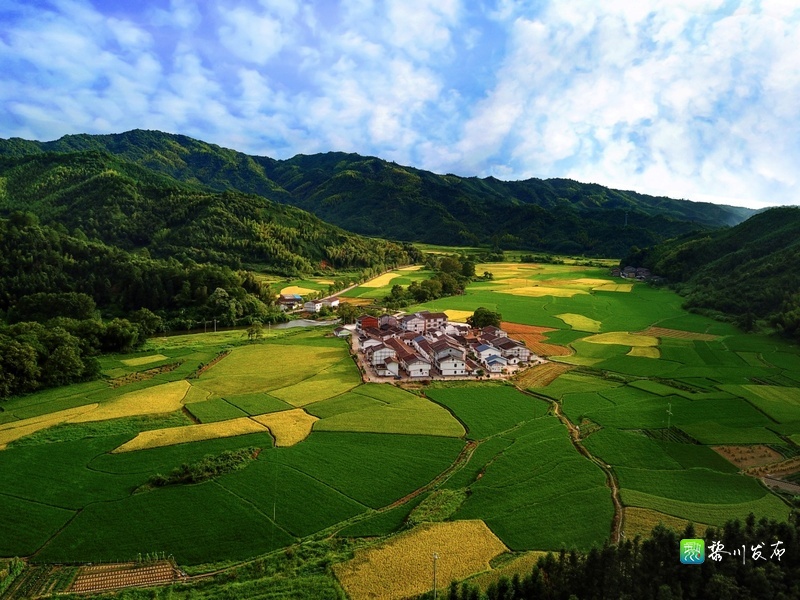 潭溪乡团村村,青山、稻田、村庄组成了一幅美丽的水彩画。