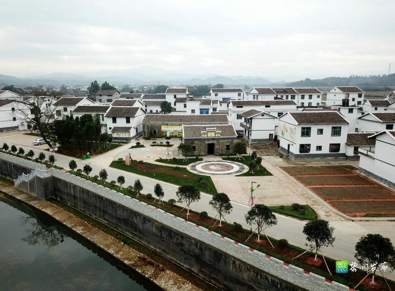 厚村乡厚村村,一排排徽派风格的安置房,与远处的青山交相辉映。
