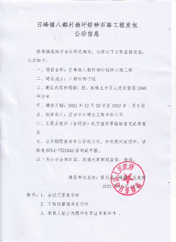 日峰镇八都村杨圩组砂石路工程发包公示信息