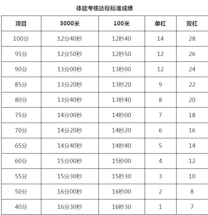2.体能测试:3000米跑、100米跑、单杠、双杠。每个项目设成绩100分,共计400分。总分低于240分、3000米未达到60分直接不进入面试环节。体能具体标准:附件1