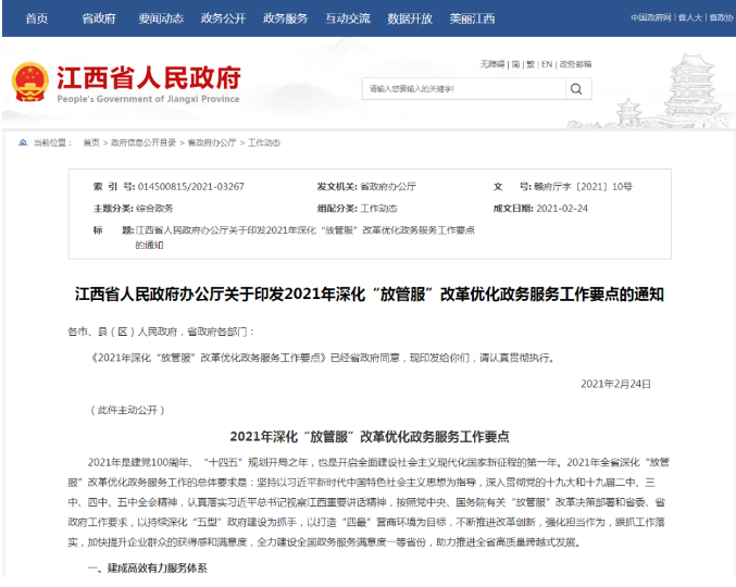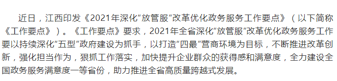 相关文件:江西省人民政府办公厅关于印发2021年深化“放管服”改革优化政务服务工作要点的通知