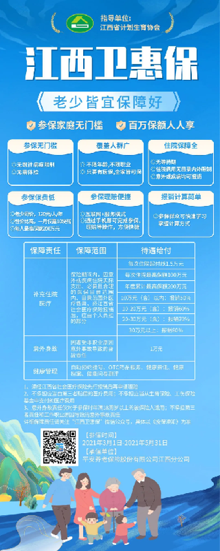 据了解,“江西卫惠保”是由江西省计划生育协会指导,平安养老保险股份有限公司江西分公司承保的普惠型补充医疗保险。面向全省所有参加基本医疗保险的城乡居民和城镇职工,克服了带病投保难、高龄投保难、投保费用高等许多“瓶颈”问题,具有门槛低、覆盖广、保费少、保障全、计算简、办理快的优势。对于有效拓展现有医疗保障体系的广度和深度,分担医药费用,降低因病致贫、因病返贫风险,巩固和深化脱贫攻坚成果,造福群众,助力健康江西、和谐江西建设意义重大。