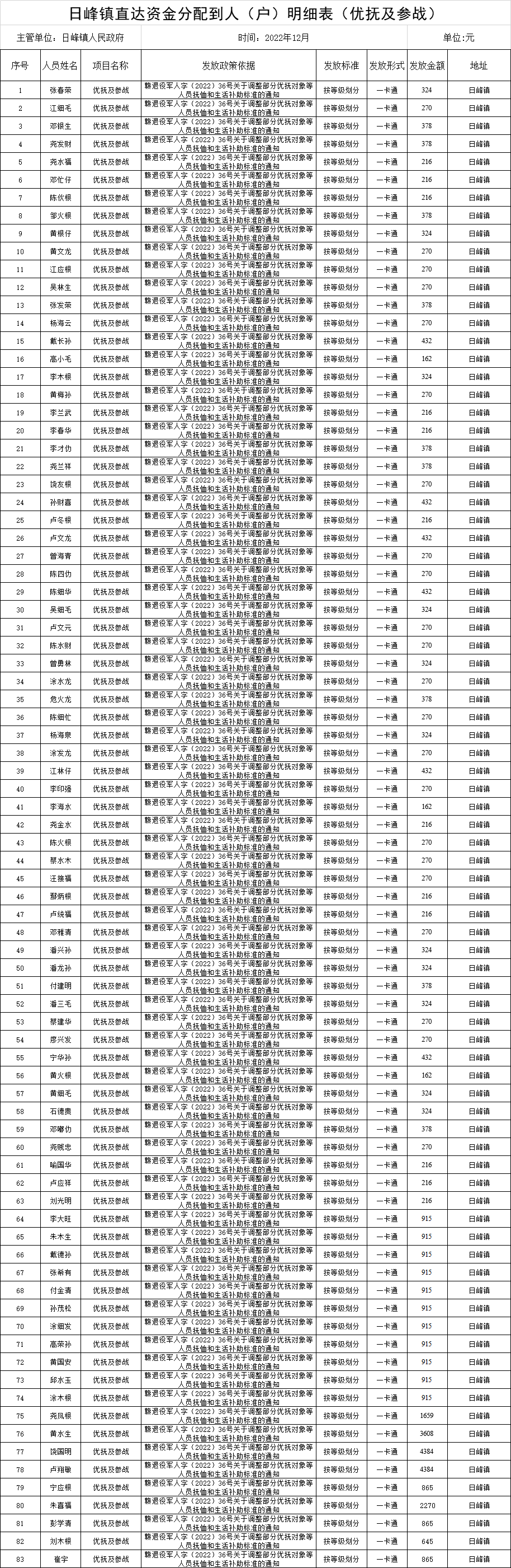 日峰镇2022年直达资金分配到人(户)明细表(优抚及参战)