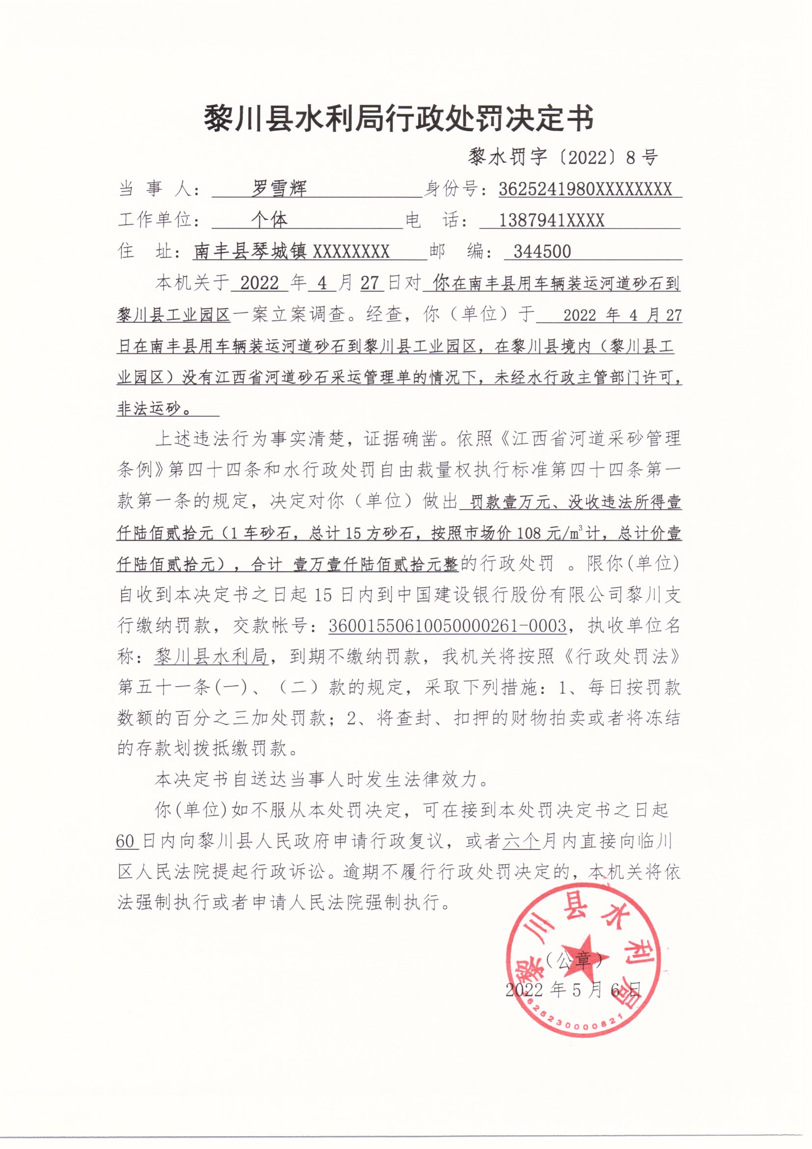 黎川县水利局关于罗雪辉非法运砂的行政处罚决定书(公示)