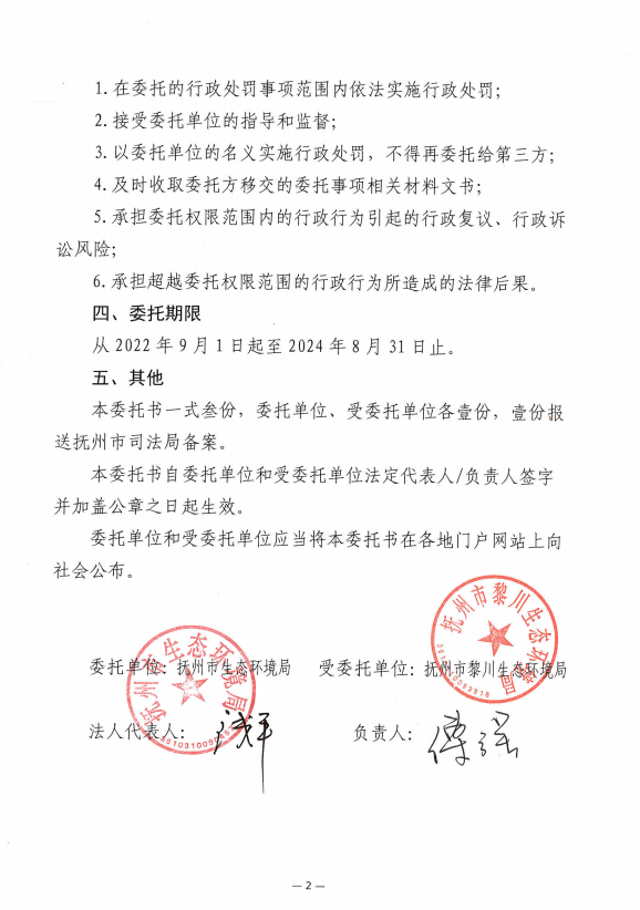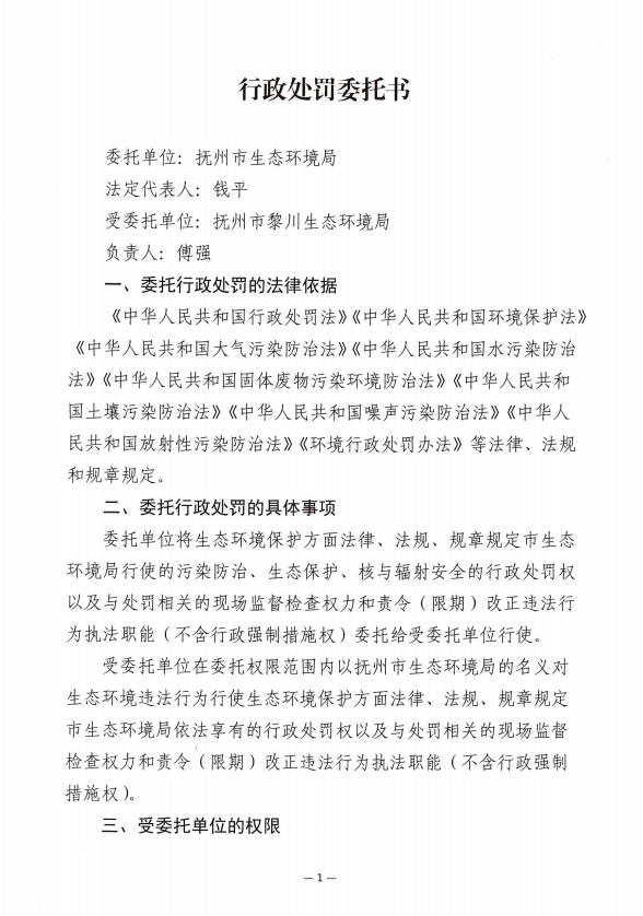 抚州市生态环境局对黎川生态环境局的行政处罚委托书