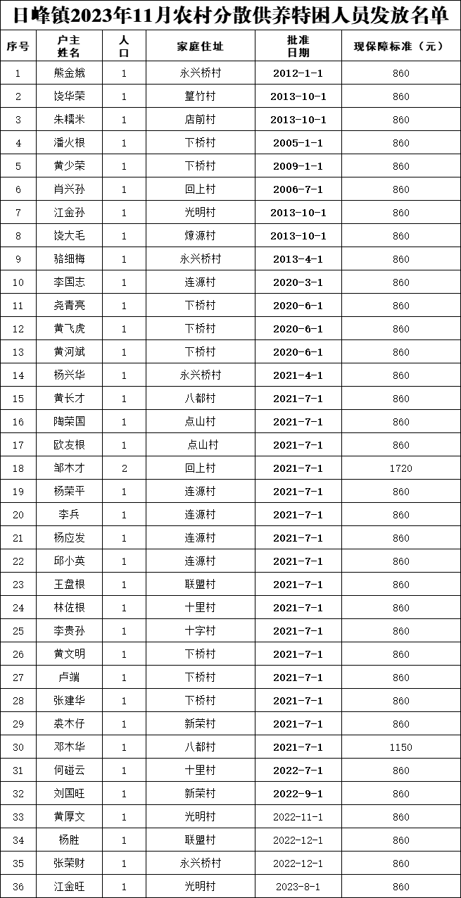 【特困人员救助供养】日峰镇2023年11月农村分散供养特困人员发放名单