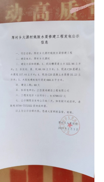 【社会公示】厚村乡大源村姚陂水渠修建工程发包信息公示