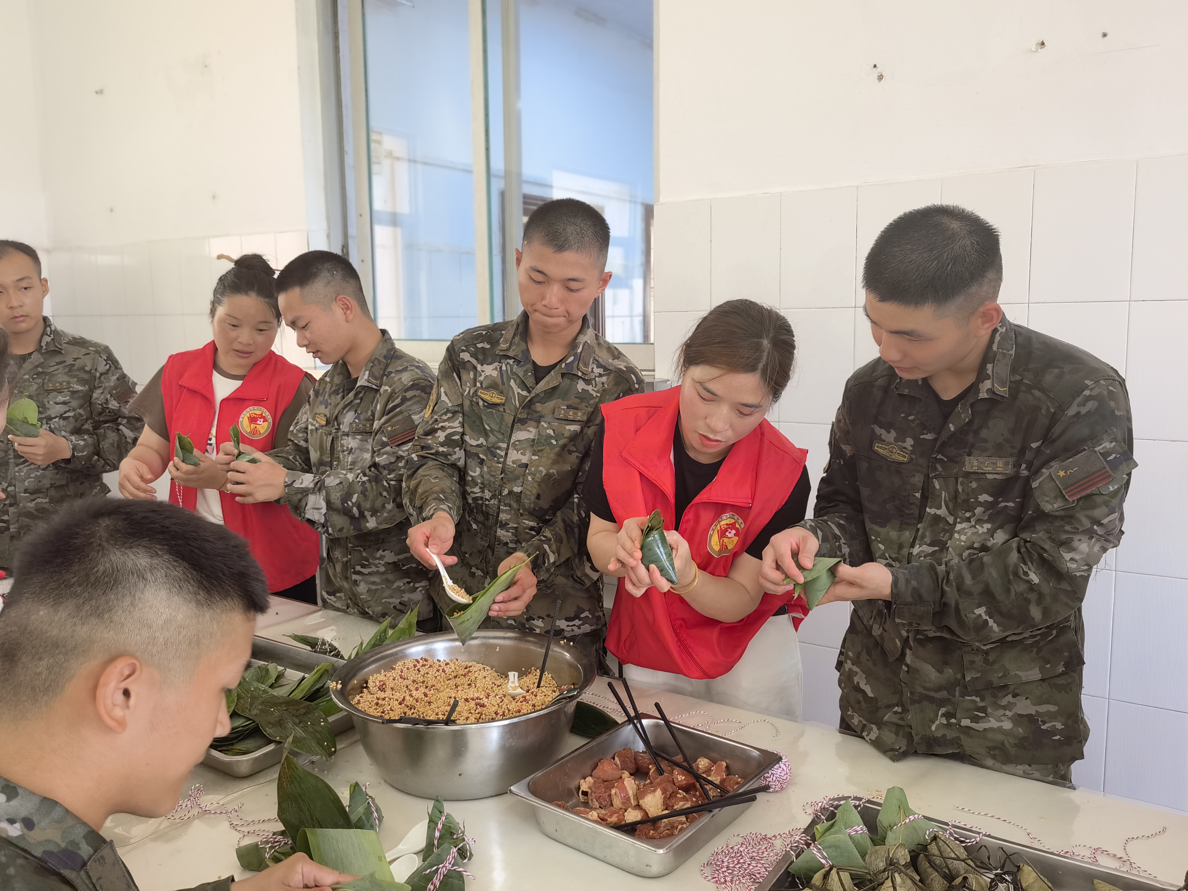 活动中,拥军服务队向部队官兵们送上了节日的祝福。同时就部队官兵们的生活情况、日常训练等方面进行亲切交流,对部队在军民共建等方面做出的贡献表示感谢。之后,在中队厨房餐厅,志愿者与官兵一起,有的泡糯米,有的理粽叶,有的剪棉线……大家边包粽子,边拉家常,互相了解军地生活。一些战士还兴趣十足地跟志愿者学包粽子,志愿者则耐心细致地给战士们讲解示范,一手托粽叶,一手抓糯米,左包右裹,边压边缠,不一会儿桌子上就摆满了大家的“战斗成果”。粽子包好后,拥军服务队还帮助战士煮粽子,并一再交代烹煮技巧及添加水的注意事项,生怕因细节的疏忽导致战士们吃不上好粽子。