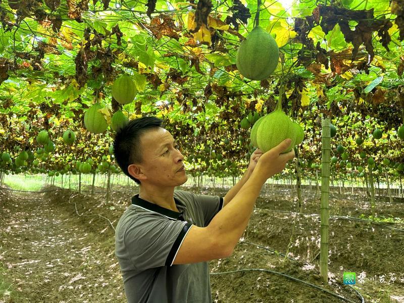 在黎川县洵口镇皮边村的瓜蒌种苗培育基地,村民在精心管护瓜蒌,基地里大大小小的瓜蒌挂在枝头,长势喜人,圆滚滚的身体随着微风轻轻晃动着,焕发出勃勃生机。
