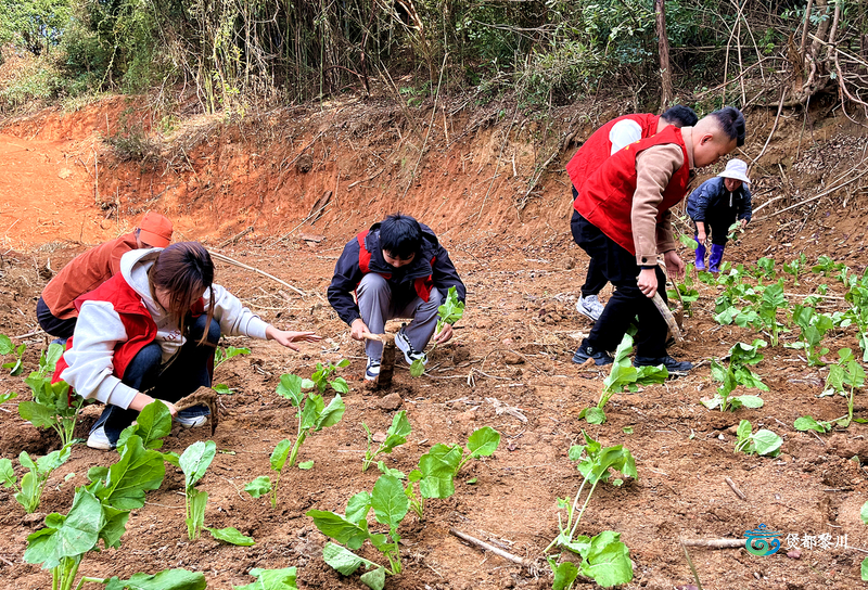 走进荷源乡炉油村,只见一抹抹“志愿红”不断穿梭在田间地头,志愿者们低着头、弓着腰,不停地挖穴、栽苗。大家分工明确,撸起袖子干劲十足,不一会儿,就栽下了一大片油菜。一抹抹“志愿红”与一片片“油菜绿”相映成趣,成了一道亮丽的风景线。