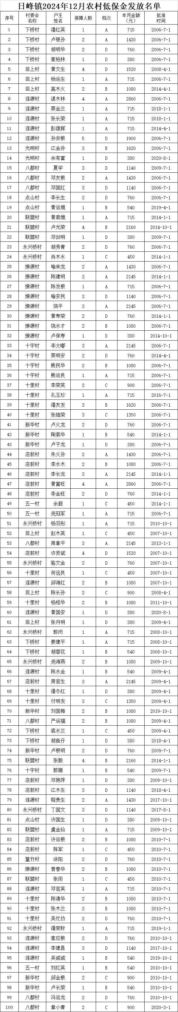 【最低生活保障】日峰镇2024年12月农村低保金发放名单