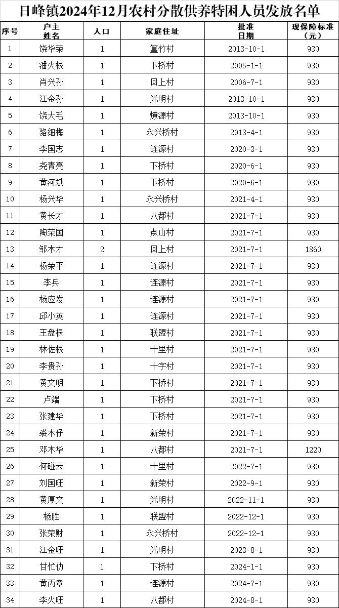 【特困人员救助供养】日峰镇2024年12月农村分散供养特困人员发放名单