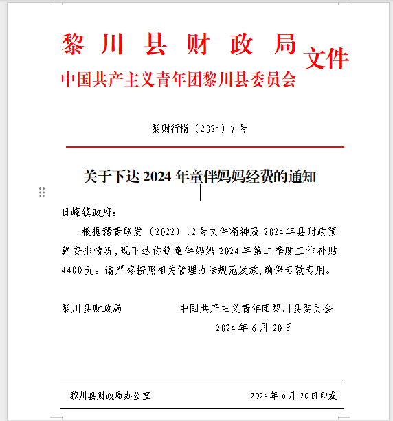 黎财行指(2024)7号关于下达2024年童伴妈妈经费的通知