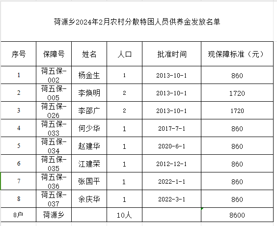 【特困人员救助供养】荷源乡2024年2月农村分散供养特困人员发放名单