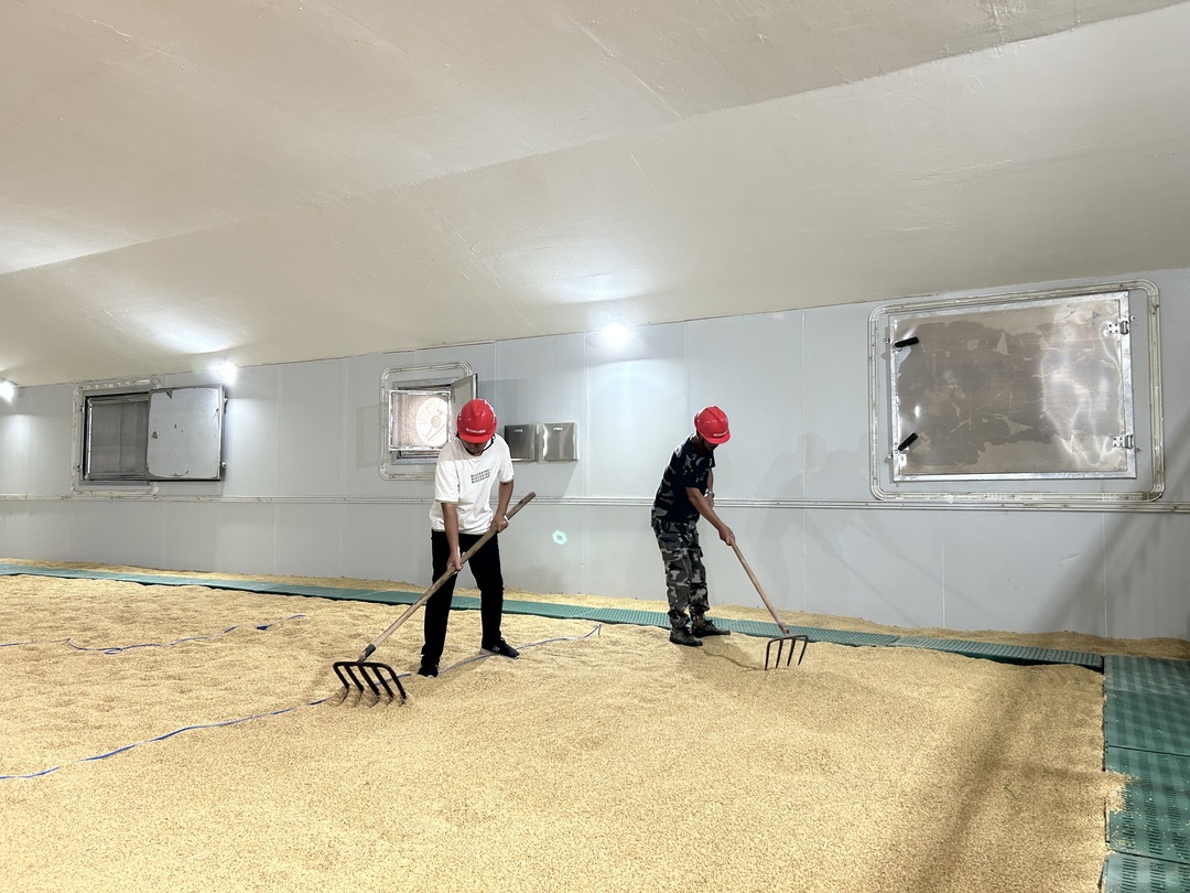 为确保新粮储存安全,公司严格执行“一车一检”制度,在粮食入库前对水分、杂质、不完善粒等关键指标进行严格检验,坚决杜绝不合格粮食入库。同时,各标准化粮仓均配备了完善的智能粮情监测系统,每个仓房内均匀布设35个测温点,构成了一个密集的监测网络,对粮堆温度进行全天候精准感知。通过智能温控系统,仓内温度始终稳定在夏季25℃以下、冬季15℃以下的适宜范围,有效防止了结露和霉变风险,为粮食长期安全储存提供了坚实可靠的科技保障。