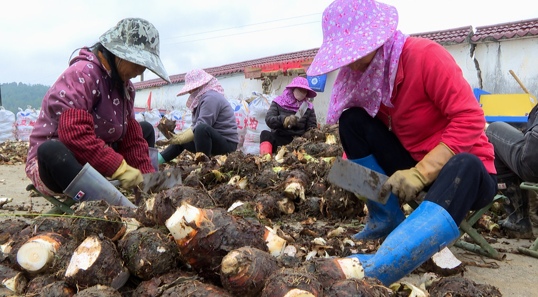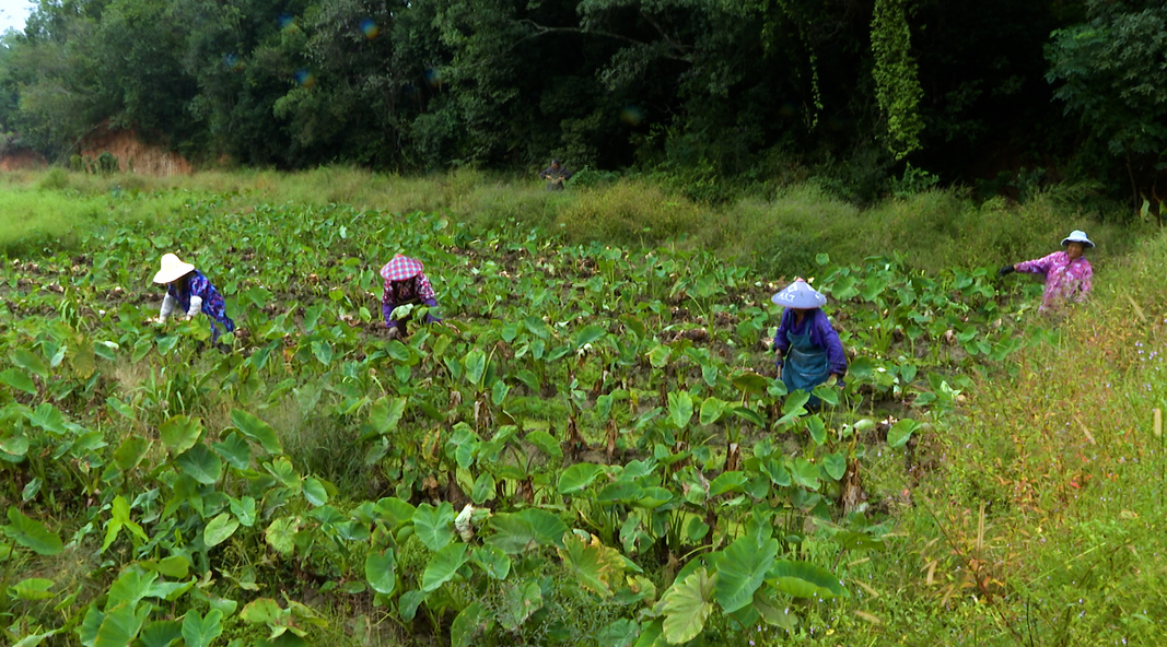 眼下,正是槟榔芋丰收时节,在中田乡河东村,田间地头一片忙碌收获的景象。
