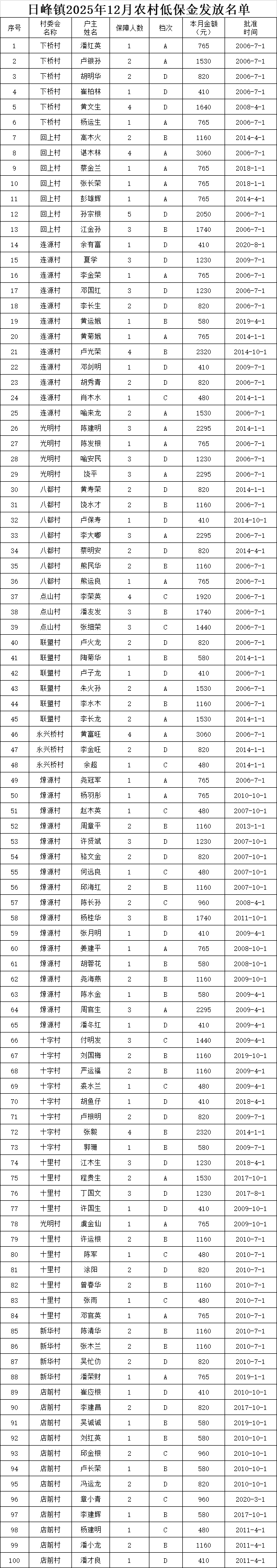 【最低生活保障】日峰镇2025年12月农村低保金发放名单