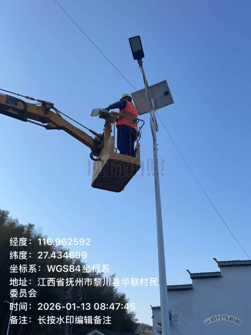 “这下晚上出门不用摸黑了!”在黎川县华联村,村民看着重新亮起的路灯,连连点赞。1月13日,华山镇组织维修人员,对华联村故障路灯开展集中抢修。工作人员乘坐高空作业车,对路灯线路、太阳能板等部件逐一检修调试,及时恢复了照明功能。