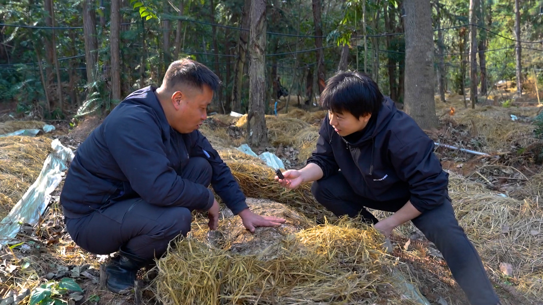 龙安镇赤松茸基地负责人 杨寅峰:我们现在用的稻草替代了这个土层,用稻草来保湿调温,