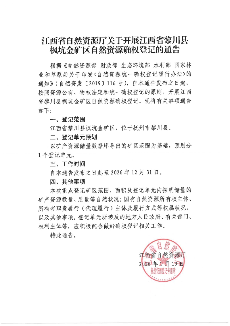 江西省自然资源厅关于开展江西省黎川县枫坑金矿区自然资源确权登记的通告
