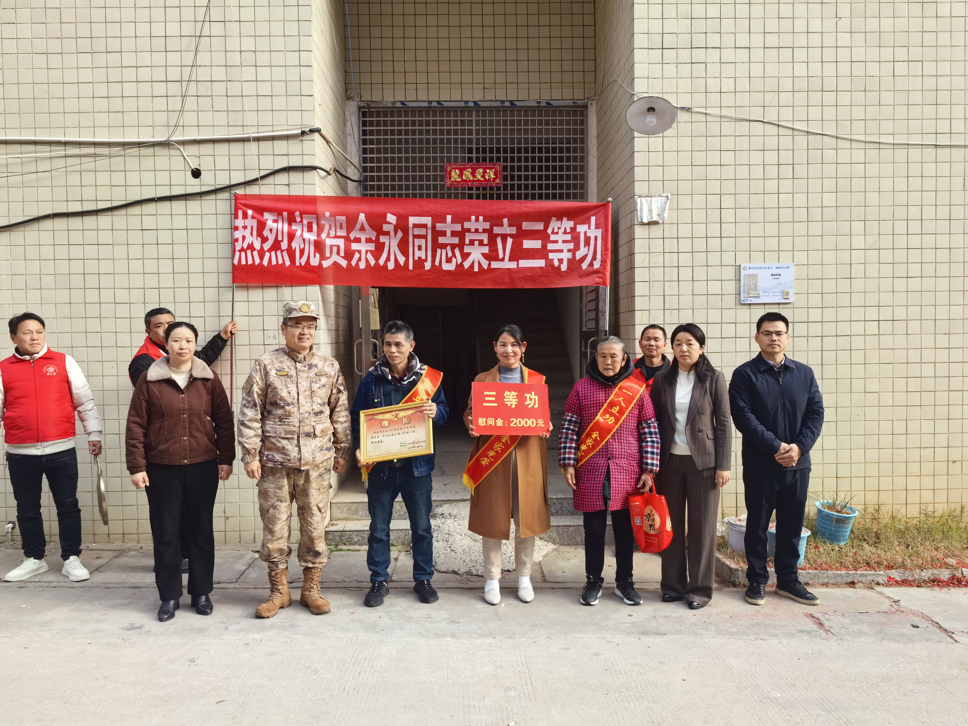 在余永、洪志强、丁家伟家中,罗峰、罗燕送上立功喜报与慰问金,为其家属佩戴绶带,详细询问家庭日常起居、生活保障等情况,并希望军属们继续当好坚强后盾,鼓励家人在军营中再接再厉、再建新功,用更多荣誉为家乡争光。