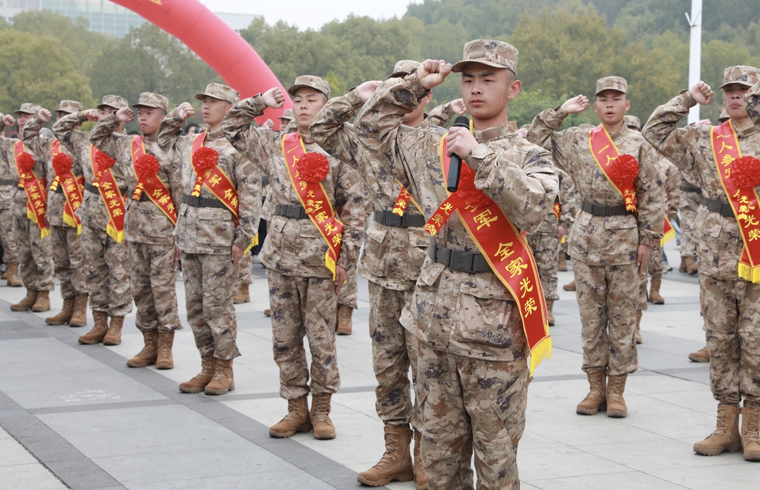 会上,刘涛宣读了新兵入伍决定。参会领导为新兵代表佩戴绶带、胸花,并发放大学生入伍一次性奖励金。全体新兵身着戎装、胸佩红花,整齐列队、庄严宣誓,铿锵誓言展现出矢志报国、献身国防的坚定决心。新兵代表、家长代表先后发言,表达了投身军营、建功立业的赤诚情怀和支持国防、送子参军的家国担当。