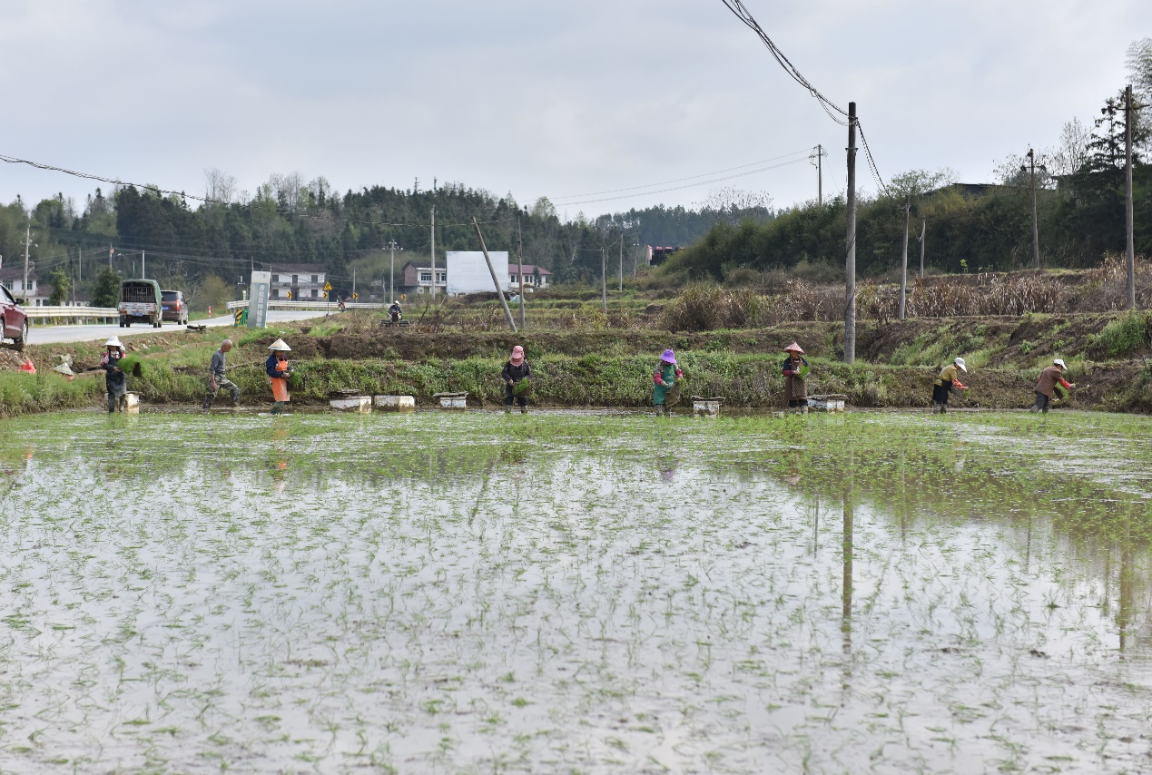走进龙安镇井戈村,只见水田里一派热火朝天的劳动景象。村民们挽起裤脚、弯腰俯身,左手熟练分秧,右手飞快插秧,动作娴熟流畅。大家你追我赶,不一会儿,一行行、一片片嫩绿的秧苗便整齐地扎根在泥土里,随风轻摆,为整片田野披上了生机盎然的“新绿”。