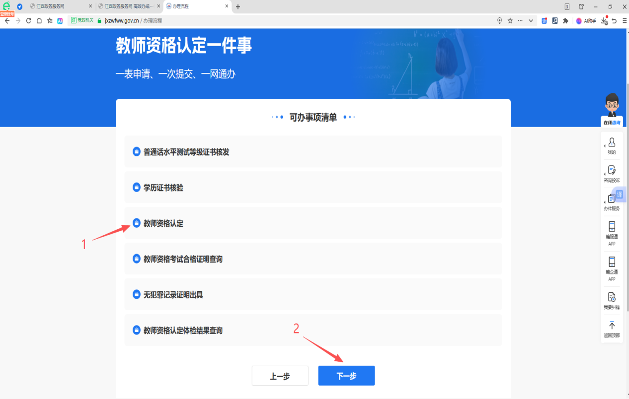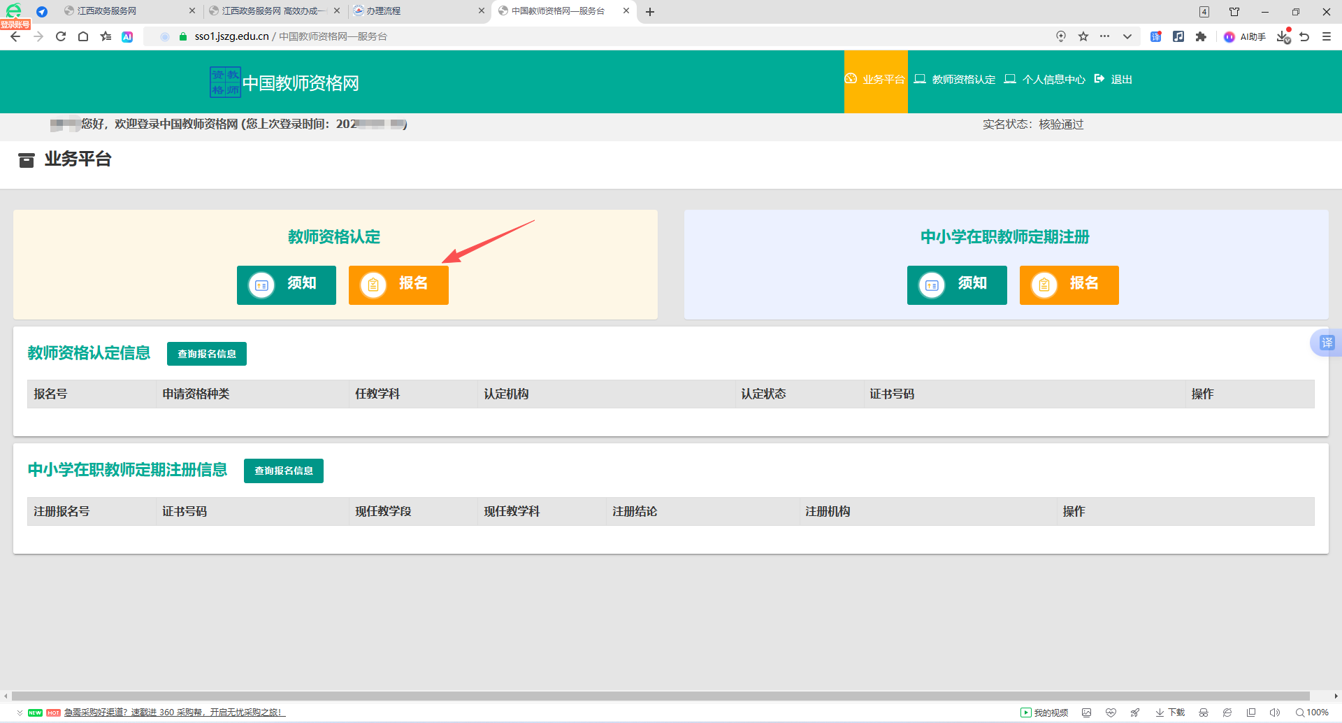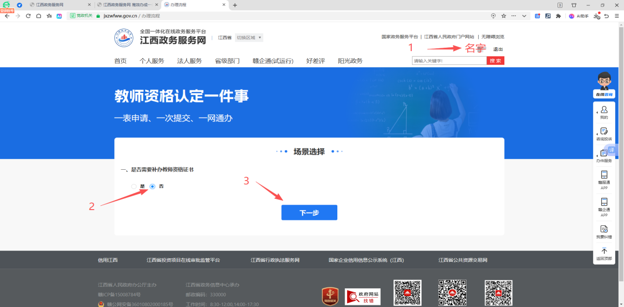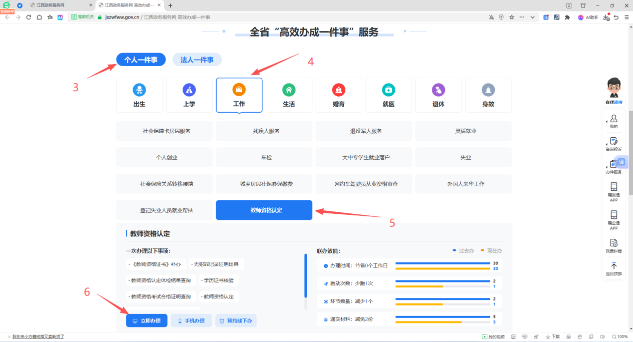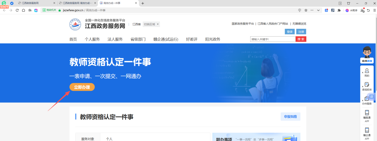 申请人在规定时间内访问“江西政务服务网”(https://www.jxzwfww.gov.cn)并进行实名注册,随后在该网站的“高效办成一件事”栏目中选择“教师资格认定”事项进行网上申报,相关流程见公告附件1。未通过江西政务服务网实名注册申请的考生,可能导致无法调取电子体检结果、无犯罪记录、身份信息等核查信息,若出现无法认定的情形,由考生自行承担责任。