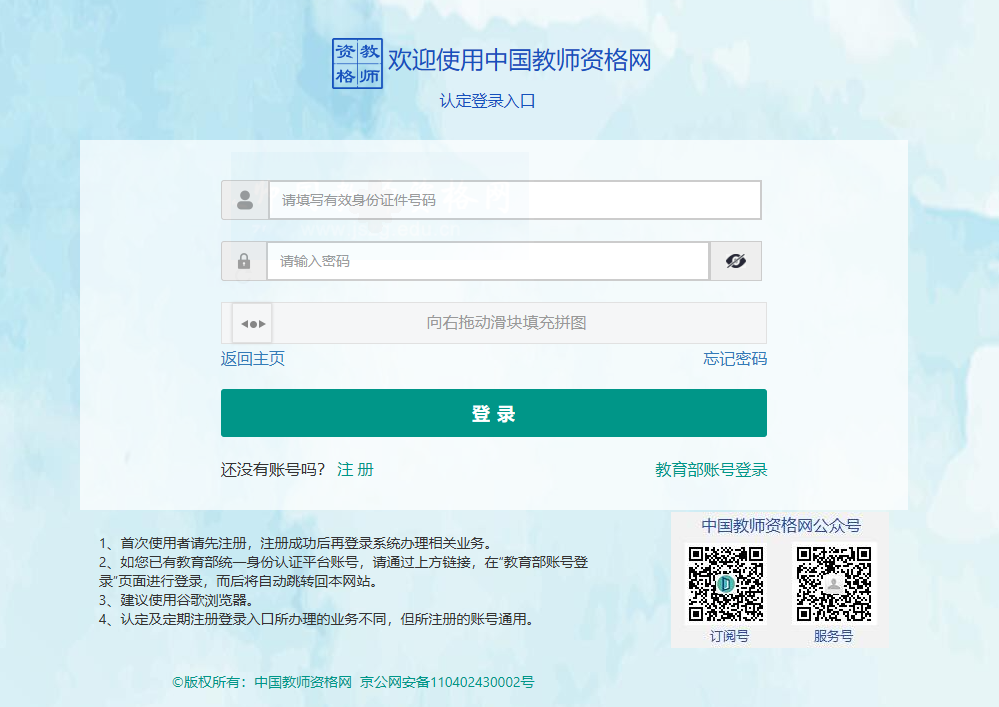 5.申请人需关注中国教师资格网,查询本人教师资格认定情况;将给申请人留言、发送认定情况,如申请人未及时按认定机构留言提交补充认定材料,逾期视为放弃本次申请认定。6.各位考生在网上报名成功后,请加入QQ群,将群昵称修改为“学段学科+姓名”,如“小学语文 李某某”。QQ群号:1093240878.