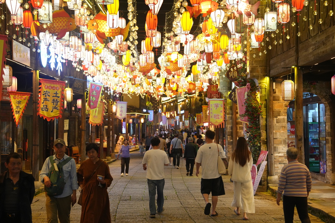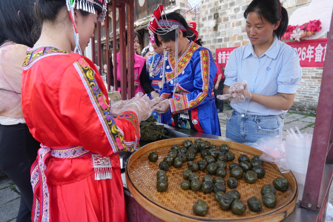 当天下午,古城畲族民俗活动正式启幕。特色“三道关”迎客仪式率先亮相,畲家阿妹身着凤凰装,以茶敬客、带领游客跳竹竿舞、印“凤凰印记”送祝福。与此同时,打糍粑、品清明果、尝山哈酒等民俗体验,踩高跷、滚铁环等传统竞技,以及手环、书签等非遗手工制作同步开展,吸引众多游客参与,古城景区处处洋溢着喜庆氛围。