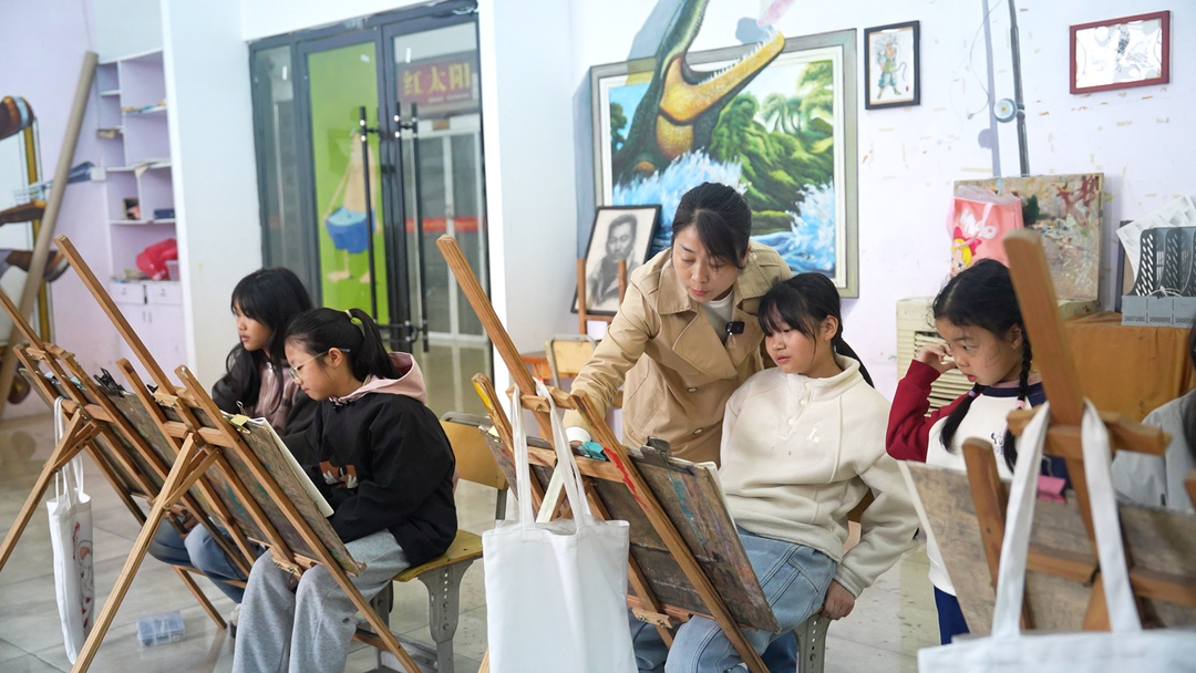 近日,在县星晨文化传播有限公司油画室里,一幅幅色彩斑斓的儿童油画作品整齐陈列,十余名孩子围坐在画架前,手握画笔认真勾勒线条、涂抹色彩,在油画师周艳丽的悉心指导下,沉浸式感受油画艺术的魅力。